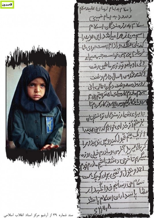 سلام به رزمندگان اسلام. اسم من زهرا می باشد، این هدیه را که نان خشک و بادام است برای شما فرستادم. پدرم می خواست جبهه بیاید ولی او با موتور زیر ماشین رفت و کشته شد. من ۹ سال دارم و نصف روز مدرسه و نصف دیگر را قالی بافی میروم. مادرم کار میکند، ما ۵ نفر هستیم. پدرم مُرد و باید کار کنیم و من ۹۲ روز کار کردم تا برای شما رزمندگان توانستم نان بفرستم. از خدا می خواهم که این هدیه را از یک یتیم قبول کنید و پس ندهید و مرا کربلا ببرید، آخر من و مادرم خیلی روزه می گیریم تا خرجی داشته باشیم. مادرم، خودم، احمد و بتول و تقی برادر کوچک هست، سلام می رسانیم. خدا نگهدار شما پاسداران اسلام باشد.
